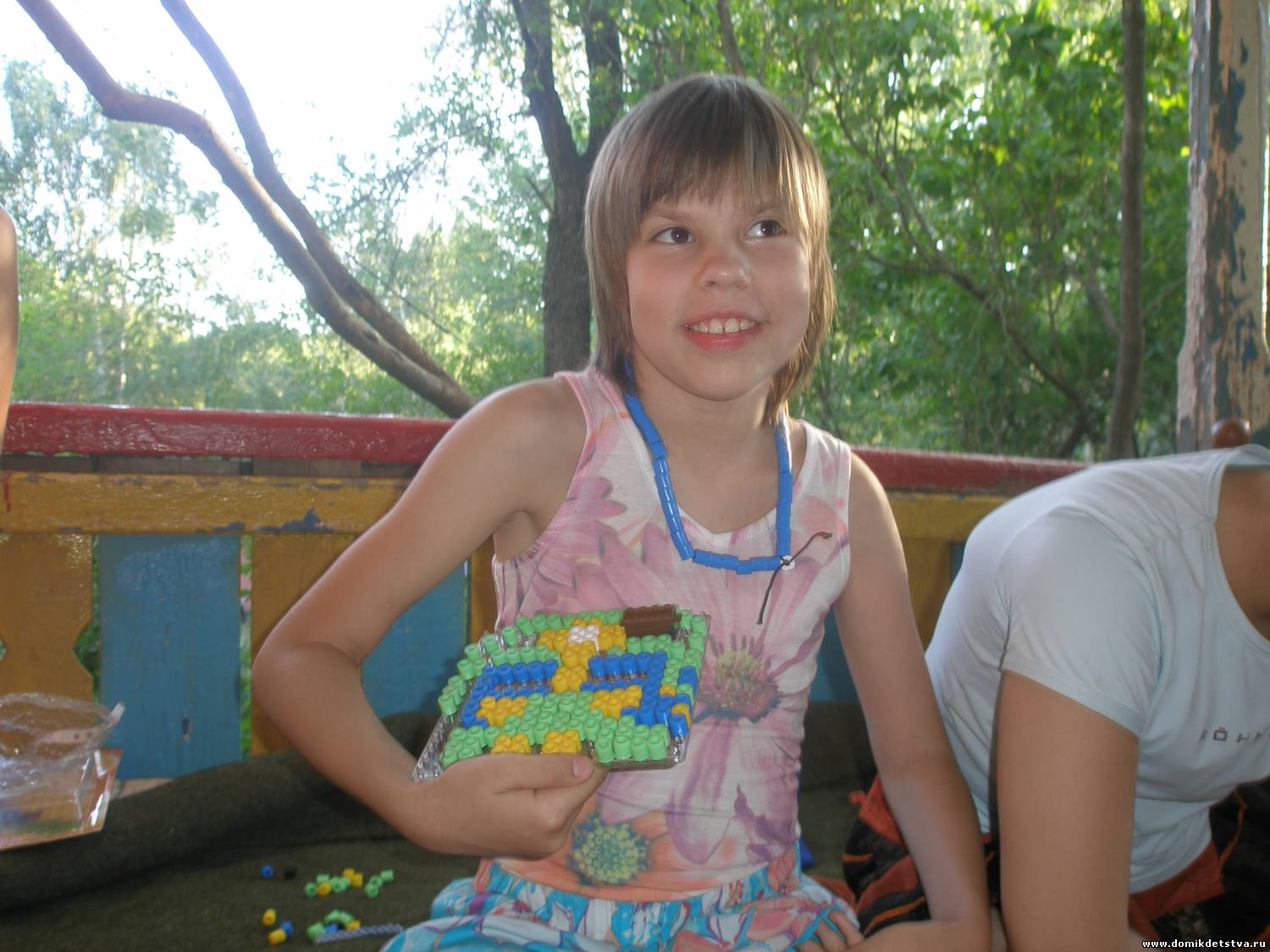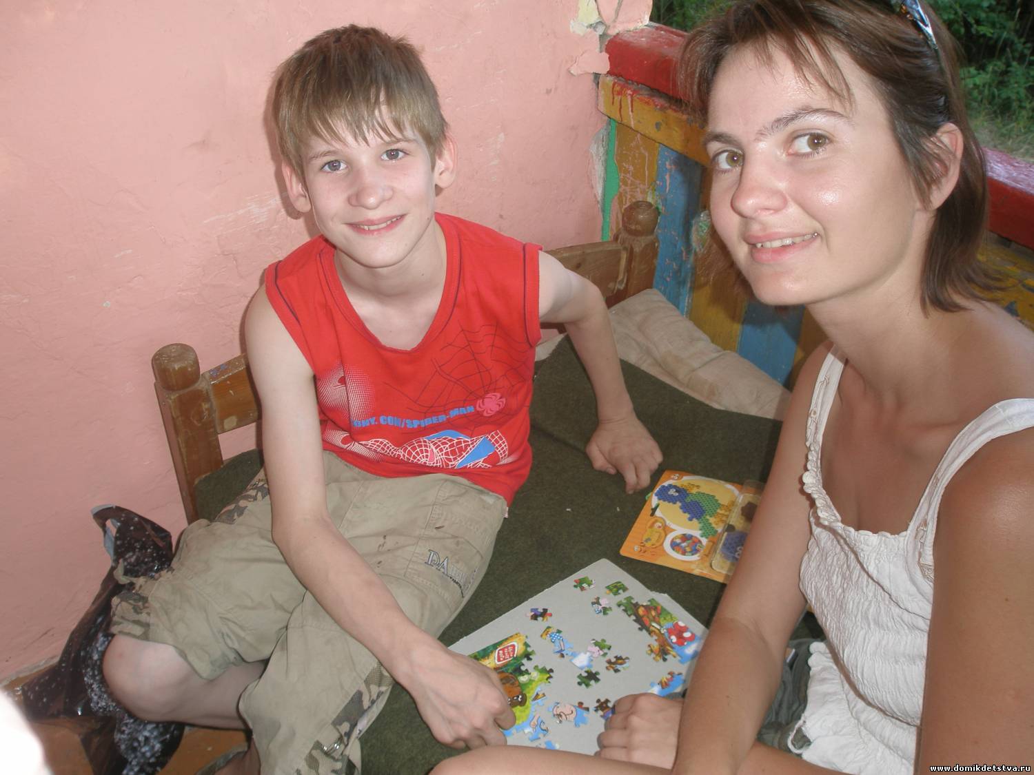 Во вторник 6.07.10 ездили в «Раздолье». Нас было, как и договаривались, 4-ро Катя, Антон, Ирина и Я. В лагерь уже заехала новая смена. Наших перевели в 8А отряд и поселили в другом корпусе. К нему нужно идти по той же дороге, немного не доходя до корпуса, в котором они были в прошлую смену, с левой стороны. Его видно с дорожки. В это раз корпус не в овраге, но зато с очень крутыми ступеньками. В общем, не учли как-то физические способности наших детей. Но дети по-прежнему рады находиться в лагере, но со слов Даши уже скучают по школе и по другим ребятам. В этот раз мы очень много общались и конечно же поиграли с ребятами в подвижные игры: кидали тарелку, играли в мяч. После Саша с Катей отправились исследовать окрестности в пределах лагеря через объектив фотоаппарата, Антон с Аней бросали мяч в кольцо, я и Ирина общались с Ксюшей "по душам". Потом все переместились на веранду корпуса и, расположившись на диванчике, дружно начали собирать пазлы и мозаику. Было все живенько, игриво, весело. Все ребята передавали огромный привет Светлане и Алене, ждут в гости. Персональный привет и спасибо за пазли передает Даша своему другу по переписке Насте. Она очень воодушевлена последней встречей. Просила передать фотку, где она в новом красивом костюмчике. Вот что у нас получилось