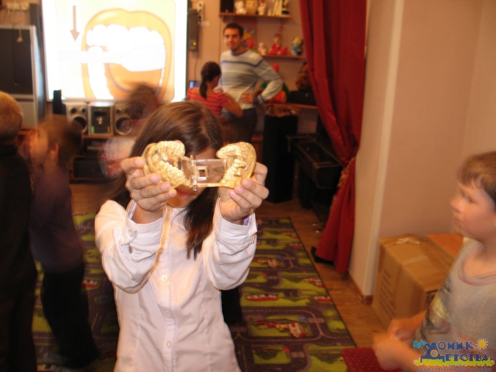 О пользе и вреде продуктов мальчишки и девчонки рассказали нам сразу, а вот с правилами чистки возникла заминка) И здесь очень пригодились муляжи челюстей и огромная просто-таки щетка, Которой ребята усердно вычищали-выметали воображаемый налет