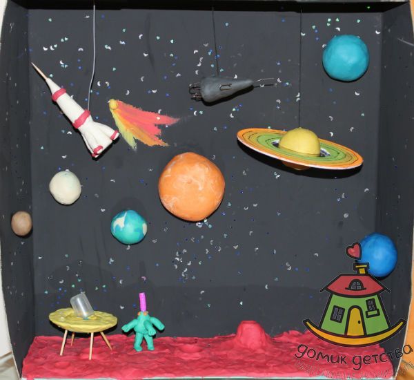 Можно немного усложнить задачу, и будет еще одна интересная форма работы с пластилином - космос в коробке (мы по такому же типу делали морское дно в коробке - одна общая работа от группы, где участие приняли все, всегда объединяет)