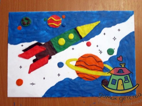 Мы делали к этой теме очень красивые коллажи космоса из пластилина на картоне (можно взять сразу черный или синий картон, а можно, как на иллюстрации, и обычный белый), по типу таких: