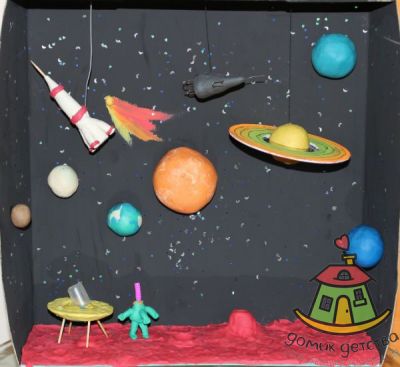 Котейко, Маша, да все верно, самые обычные коробки. Посмотри варианты таких поделок в интернете (запрос "поделка космос в коробке" или типа того) - расположить коробку можно как дном вниз (и просто ставить на него поделки), так и дном вертикально (тогда оно служит задней стенкой, а на "потолок" можно подвешивать поделки - просто возьми с собой нитки и иголку покрепче, пусть ребята делают поделки, а ты самостоятельно размещай).